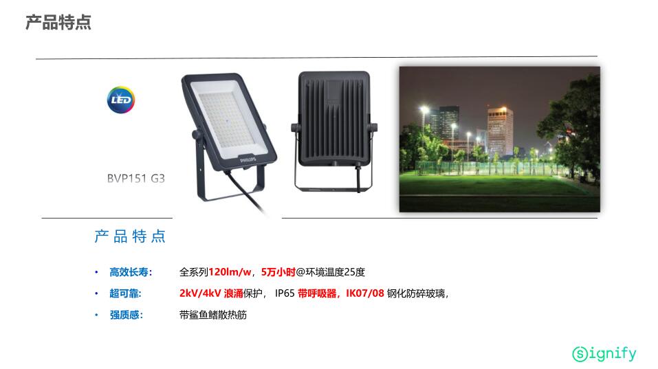 飞利浦BVP151 300W 6500K LED投光泛光灯是飞利浦明晖BVP151系列中一款,是一款高性能的户外LED泛光灯系列,广泛应用于建筑照明、景观亮化、停车场、广告牌及安全照明等场景。该系列灯具以高效节能、长寿命和高可靠性著称,支持多种功率和色温选择,适应不同环境需求。